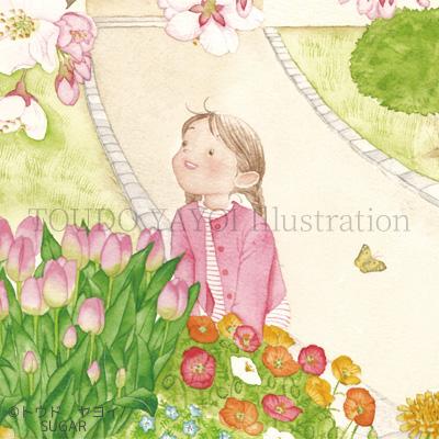 ヴィーガンキッズプロジェクトが発行する絵本「はるさんとこぶたさん」の表紙イラストの抜粋です。動物への思いやりの心をもつ子ども達をサポートする内容になっています。透明水彩のような、やさしい雰囲気のイラストが得意です。