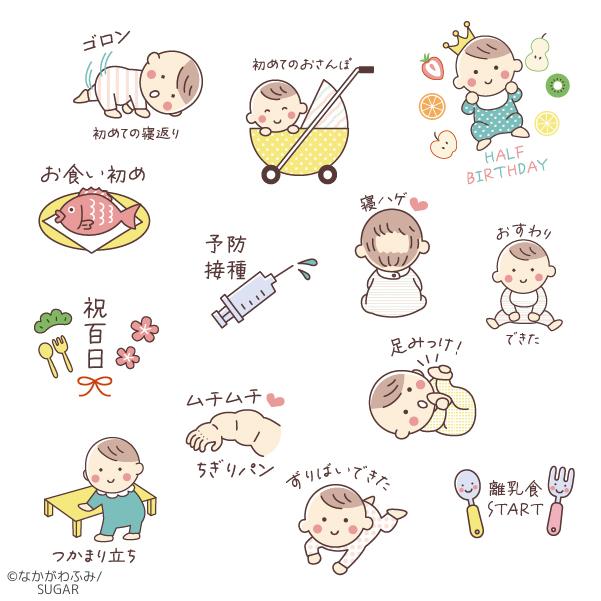 子ども用品専門店「のびしろキッズ」様 育児を楽しく記録できる【育児シール】のイラストを担当しました。
