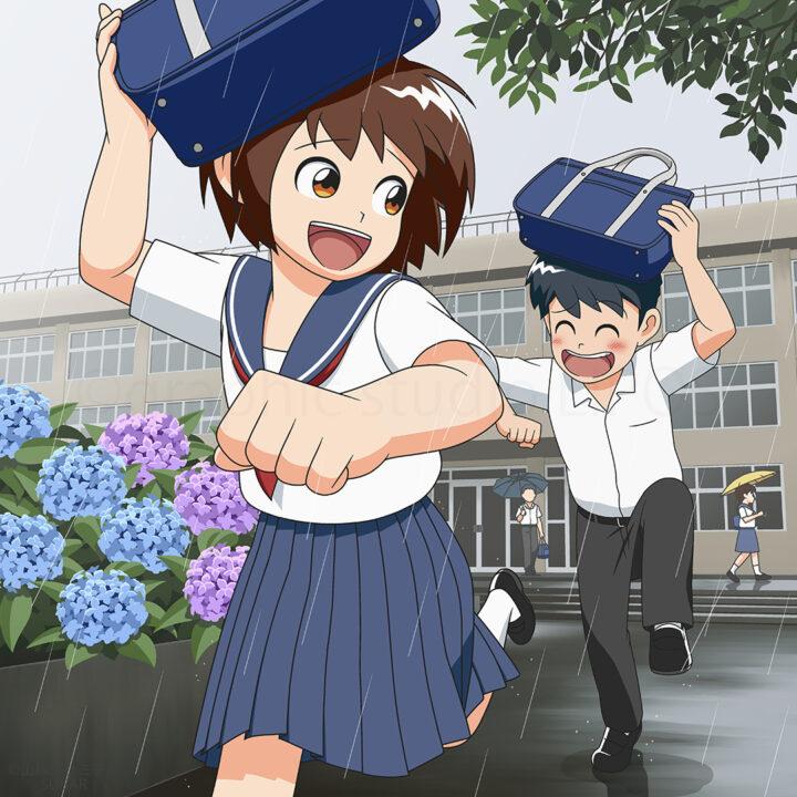 傘を持たずに雨の下校時刻を迎えてしまった男子生徒と女子生徒。 少しでも濡れないようにと走る2人の姿は、困っているのにどこか楽しそうな雰囲気。 特に男子生徒は思いがけず片思いの女子生徒と一緒に帰ることができて、内心は「雨に感謝!」…というイラストです。 梅雨の情景と学生ならではの微笑ましい一幕を切り取り、どこか懐かしさや青春の甘酸っぱさを感じさせる仕上がりを意識しました。