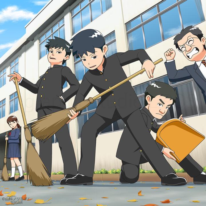 学校の掃除時間、中庭で清掃を任された男子生徒3人…のはずが、彼らは掃除道具を武器や防具に見立ててゲームやアニメのキャラクターになりきり、真剣な表情でふざけている様子。 …そんな男子中学生らしい「あるある」の一瞬を切り取りました。 そんな彼らをシラけた目で遠巻きに眺める女子生徒と、情けなさを感じながら注意を飛ばす先生のコントラストが生むおかしさを意識して作画しました。