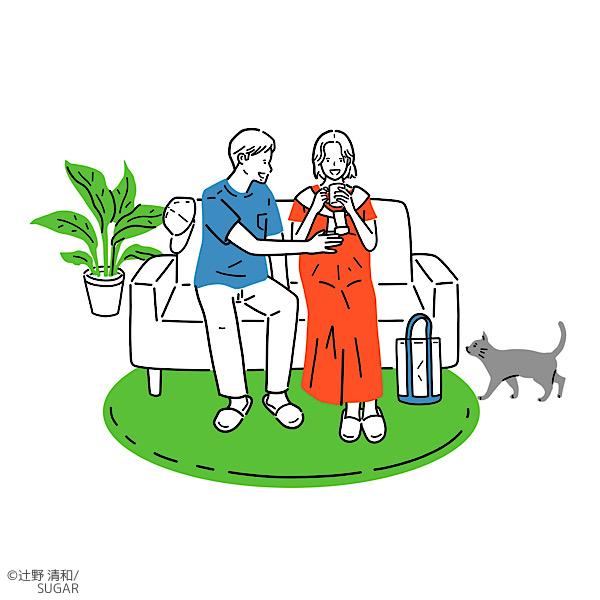 【三井林業ホームテック DM用カット】 マイホームでくつろぐファミリーのイラストを制作しました。 広告 広報 パンフレット リーフレット カタログ チラシ ちらし 冊子 健康 人物 男女 親子 夫婦 家族 家庭 ファミリー 生活 暮らし リビング 部屋 社会 線画 パステル ポップ ほのぼの リラックス 優しい やさしい 柔らかい やわらかい