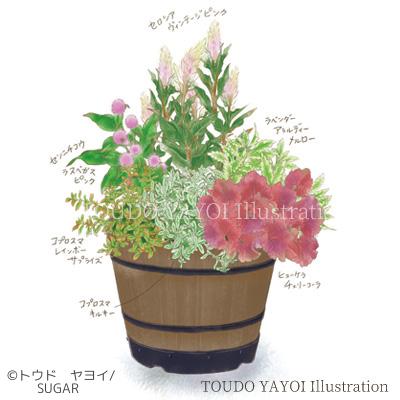園芸雑誌寄せ植え図コーナーのイラスト。 1年ほど担当していました。 書き文字も合わせ担当致しました。 作業環境・・・・アナログ水彩 納品形式・・・・原画形式