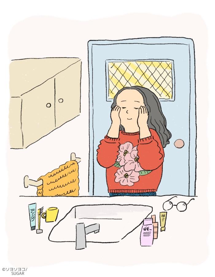 外出前の、身支度の様子を描きました。日常を温かみのあるタッチで表現しています。 シニア向け女性誌の挿絵をイメージしています。