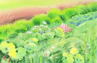 高原をテーマに、植物や動物、景色などのイラストを描きました。