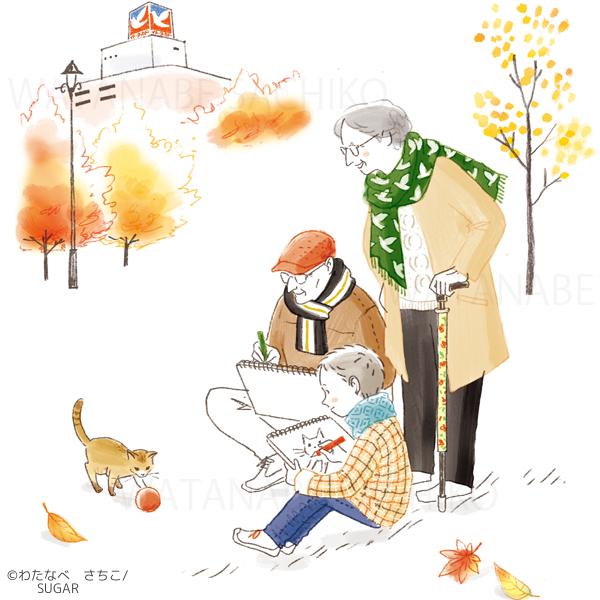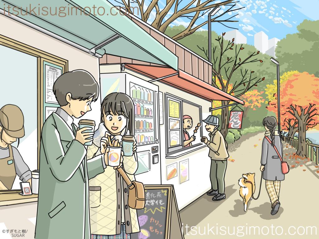 穏やかな秋の公園でのワンシーンイラストです。