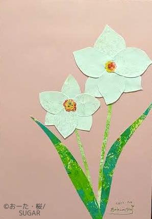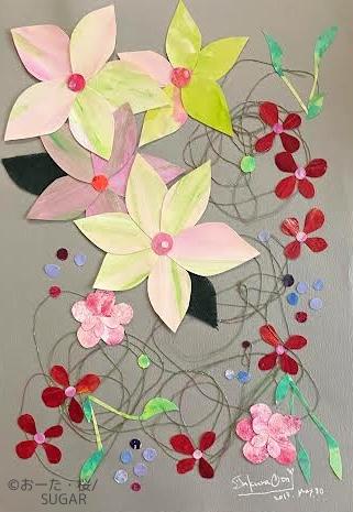 パステル画で台紙を作り、コラージュやステンシルをし作品を作っています。 花や抽象画など、あたたかみある優しい色合いでの作品が特徴です。