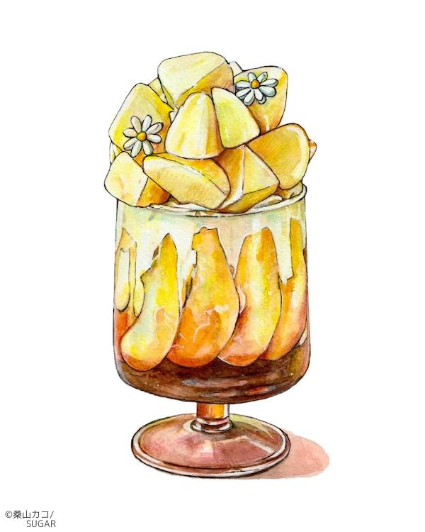テーブルの上にあるのは、プリンアラモードや桃のパフェ、夜空に浮かぶドーナッツ。