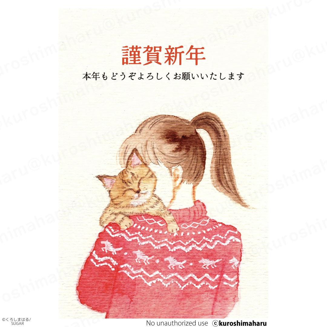 2026年 午年の馬柄セーターとポニーテールがポイントです。 寒くなってきて抱っこされたがる家猫(キジトラ)を描きました。