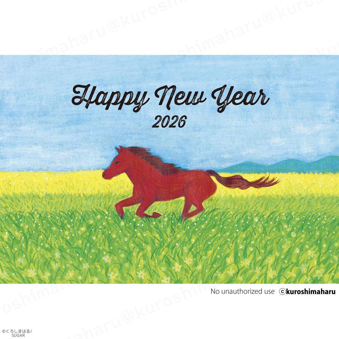 2026年午年の年賀状で馬を手描きいたしました。 早咲きの菜の花畑の風景です。