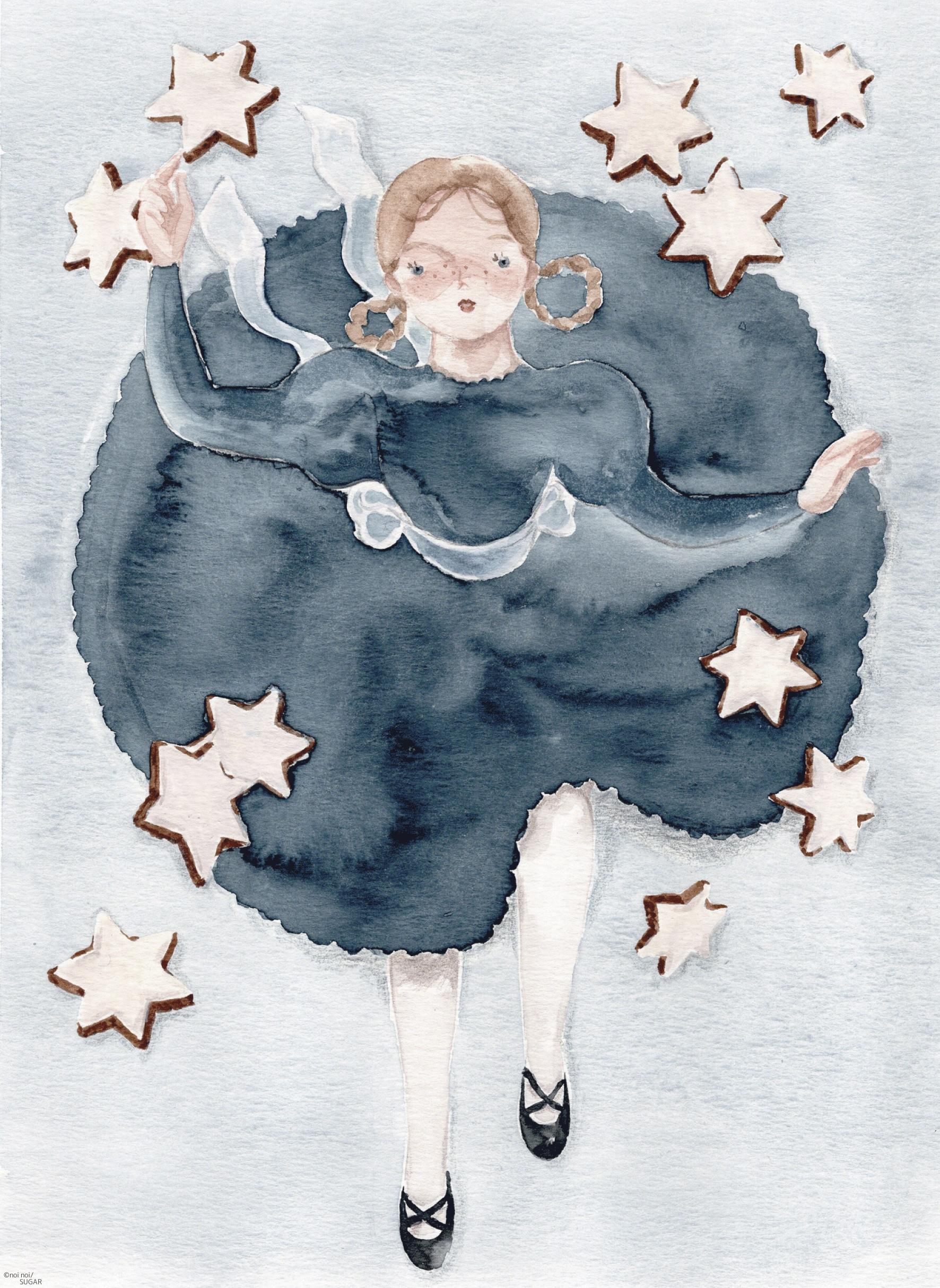 "星を掴む" ドイツの伝統的な六芒星のクッキー、ツィムトシュテルネを宙にちりばめて。 物語のあるイラストを、淡く印象的な水彩で制作します。