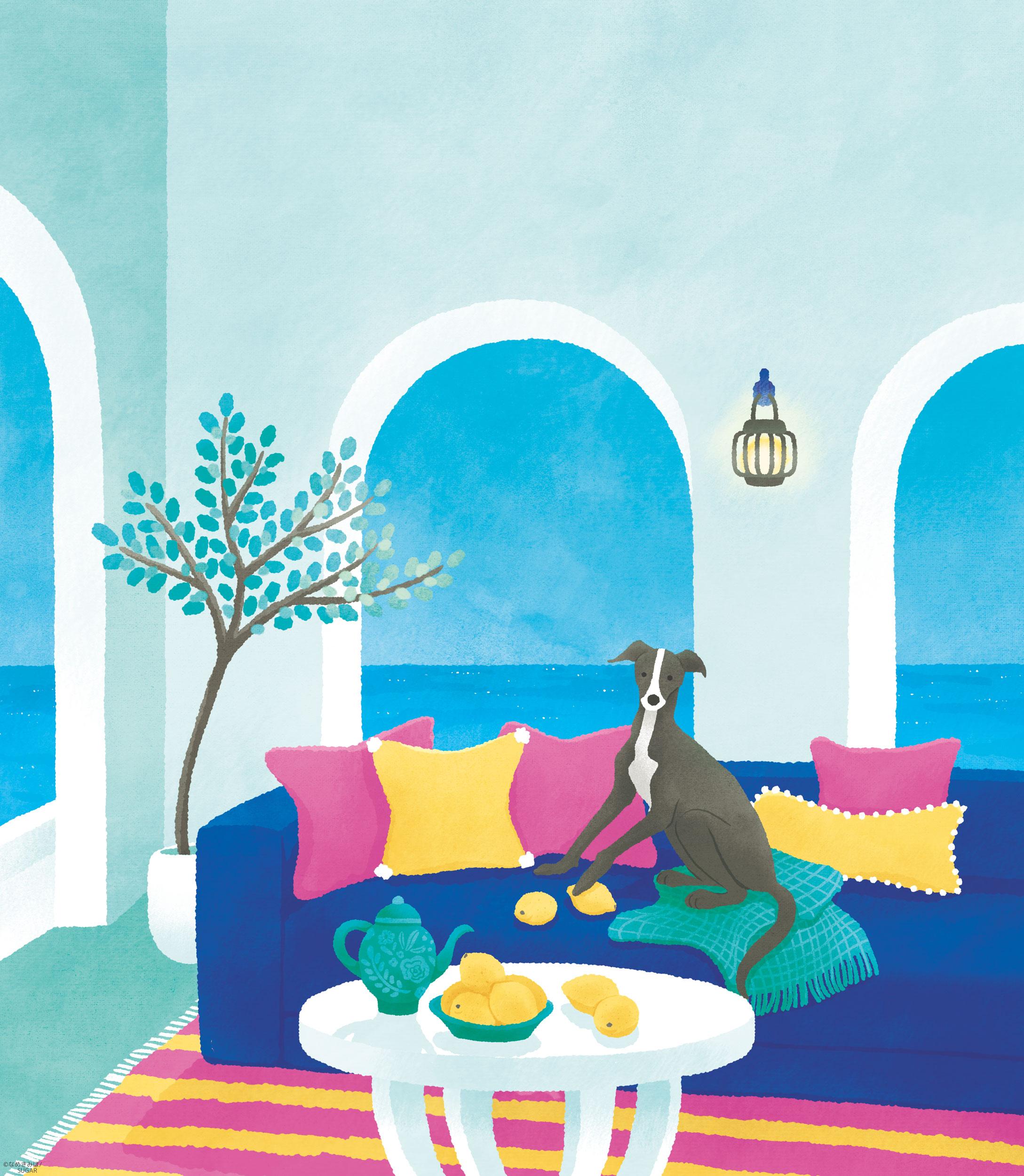季報「住宅金融」2025年夏号 表紙イラスト 住宅金融支援機構が発行する広報誌「住宅金融」の表紙イラストを2023年より担当しています。 季節ごとのインテリア×動物のイラストを描いています。 2025年夏号は、青い空と海を背景にビビッドな色合いのインテリア。 イタリアングレーハウンドがレモンで遊んでいます。