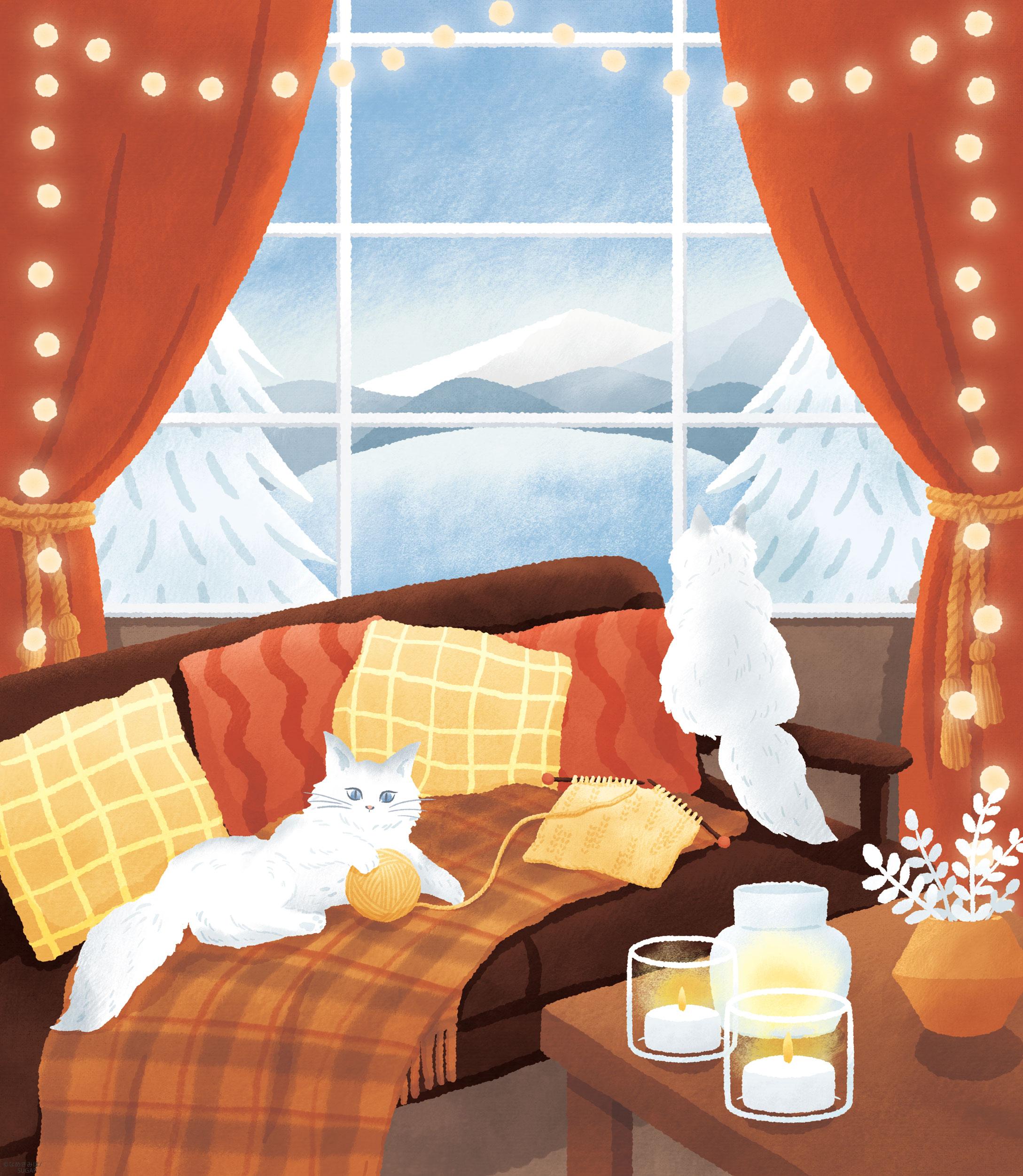 季報「住宅金融」2025年冬号 表紙イラスト 住宅金融支援機構が発行する広報誌「住宅金融」の表紙イラストを2023年より担当しています。 季節ごとのインテリア×動物のイラストを描いています。 2025年冬号は、雪景色を臨む暖かいお部屋。 毛糸玉と戯れたり、窓の向こうを眺める猫を描きました。 この号で、3年間の表紙担当が終了しました。 毎号悩みながらも、楽しく制作させていただきありがとうございました。